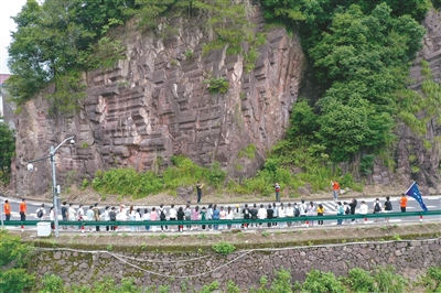 “富阳地貌类型丰富,岩石品种多,褶皱、断层节理等现象也不少,这些都是很好的教材。”张建龙介绍,曾有湖源新二村村民联系自己,说在湖源钟塔山一带发现了“恐龙蛋”,但根据他对当地地质的了解,觉得不太可能。于是他专门去现场考察,最后证实是球泡流纹岩,是不多见的火山遗迹。他说,看起来像“恐龙蛋”的球泡状构造,其实是熔岩中的气体在流动过程中没能溢出,被包裹在冷却后的岩石之中形成的空腔。此外,在湖源石龙村汤家自然村,张建龙还发现了一组特别的节理石柱剖面。“与常见的原生柱状节理有所不同,汤家柱状节理呈近水平横卧状,很少见,”张建龙说,平时见到的柱状节理绝大多数是与地面垂直或倾斜的,仅在洞头大鹿岛有部分横卧,“这些都是富阳独特的自然地理资源,具有较高的研究价值。”