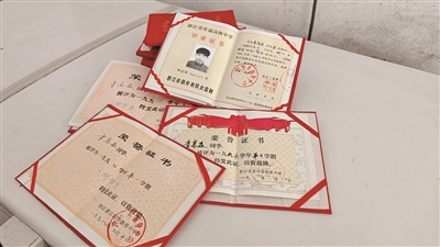 过了一会,章玉庭拿出一个红色塑料袋,视若珍宝。他小心翼翼拿出一本本红色封面的证书,包括三好学生、优秀班干部、学习积极分子等。
