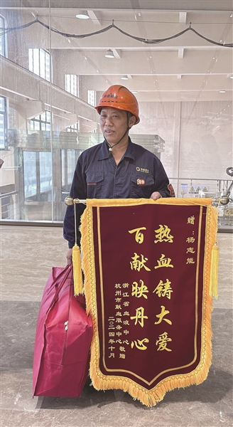 杨志能,今年54岁,居住在鹿山街道。他第一次献血是在2018年,短短6年,他共献血116次,累计献血45700毫升。他说,起初是响应新登镇里的号召,由单位组织献的血。后来在献血时认识一位热心大姐,在她的带领下,经常跑到杭州献成分血,奔着做公益事业去的。