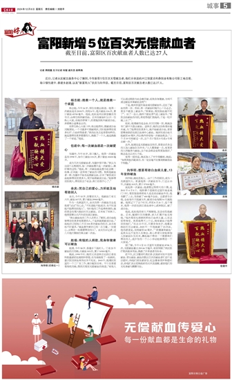 近日,记者从区献血服务中心了解到,今年新晋5位百次无偿献血者,他们分别是杭州江铜富冶和鼎铜业有限公司职工杨志能、场口镇包建中、春建乡赵瑾,以及“新富阳人”余庆与向华琼。截至目前,富阳区百次献血者人数已达27人。