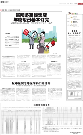 富阳国际贸易中心大酒店餐饮部经理郑以伍告诉记者,年夜饭预订情况还不错,20多个包厢已经预订完了,大厅的预订量也达到90%以上,仅剩少量余位可以预订。“12月初的时候,包厢就订光了。”郑以伍说,有的客人前一年吃完年夜饭就续订了后一年的。