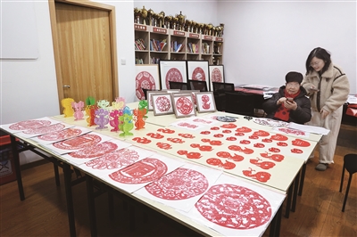 记者一走进郎苏华的工作室,就看到满满当当却又形态各异的蛇年新春剪纸作品。郎老师热情地向记者介绍这些“宝贝”:“这是‘巳巳如意’富贵蛇、福上加福钱多多,这是大头蛇、水蛇,这是蛇宝宝……”郎苏华说,每到新春,她都要创作一批生肖剪纸作品,多年累积下来,已经有好几本厚厚的创作绘本。