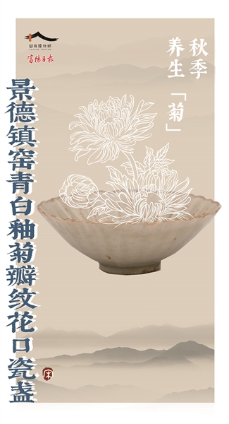1973年采集于富阳砖瓦厂,国家三级文物。器物高4厘米,底径3.6厘米,口径11.2厘米,敞口,斜腹,碗内有出筋菊瓣纹装饰,全身施青白釉,造型生动形象。(制图 黄睿)