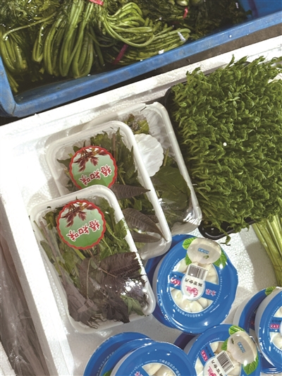 另外,记者还在不起眼的角落里发现了香椿的身影。有着“树上蔬菜”美誉的香椿已经悄悄上市,但是市场里卖的摊位还不多。“香椿12元一盒。”摊主老方说,一盒大概二两,算下来60元一斤。“这种盒装的比较便宜,散称的会更贵一些,我们就没有进。”