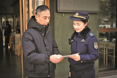 区综合行政执法局鹿山中队执法队员黄亚楠,正在向一家餐饮店的负责人宣传垃圾分类知识。她说,垃圾分类不仅保护环境、节约资源,还能带来经济和社会效益,希望大家都能积极参与垃圾分类。