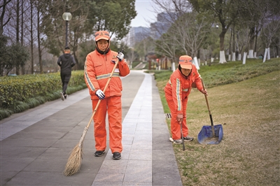 在江滨西大道大风车附近,环卫保洁员董志仙和朱小莉在清扫路面的垃圾。每天上午6点至10点半,以及下午1点半至5点,两人都要对保洁辖区进行一次清理。她们说:“虽然日常工作任务重,但这里的游客和早晚前来散步的居民很多,把公园清扫干净,让大家看着舒服,有更好的游玩体验,我们的辛苦就有价值。”