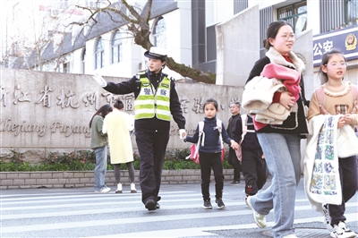 区实验小学门口,公安富阳分局交通警察大队城区中队秩序民警董欣铭正忙着保障学校周边交通畅通和安全。2024年8月参加工作的她,从事早晚高峰执勤、交通指挥等工作,重点针对学校周边的拥堵点位进行治理。