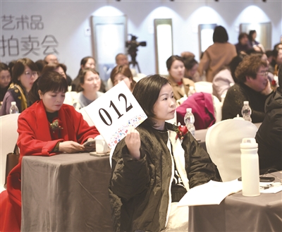 女企业家邵春霞在书画艺术品慈善拍卖会上频频举牌,献出一份份爱心。