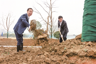 活动现场,区领导三五一组,挥锹铲土、扶苗培土、提水浇灌,合力栽下樟树、黄山栾树、桂花、红叶石楠共150余株。