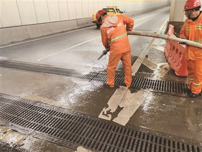 隧道内的照明、通风、消防等设施的全面检查维护也是重点内容之一,工作人员每周对隧道边沟进行机械化清理,每隔15天清洁隧道内壁,清除污渍灰尘,以保障隧道内整洁度和明亮度。同时,对横截沟、泵房及沉淀池进行垃圾清理和清淤,对隧道内的交通标识进行更新清洁完善,保障隧道排水通畅、行车安全。