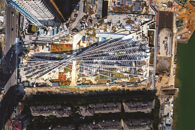 记者在施工现场看到,工人师傅们基本为两三人一组,分散在场地内安装龙骨。由于屋顶结构复杂,站立位置受限,施工全靠搭乘登高设备进行。“整个屋盖施工都是高空作业,像主桁架吊装使用了800吨履带吊。而次梁、张弦梁、折梁都是焊接而成,工程繁复又艰巨。因为是异形屋盖,我们现在看到的每一处结构,其实形状、数据都不一样,涉及大量精确到小数点后三位的三维建模计算,再根据计算结果一段一段焊接起来。”中铁十四局项目现场生产经理郑龙雨说,“而且钢结构还存在热胀冷缩的情况,施工时对环境要求很高,如温度要在5—35℃之间,湿度不能超过30%,再加上露天高空作业要避开风雨天气,所以事实上我们施工的限制非常多。”