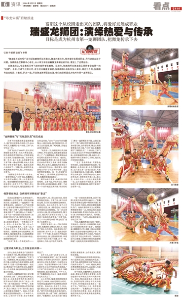 在去年的首届富春山居半程马拉松和百村篮球赛的开幕式现场,都有瑞盛龙狮团的助阵。“能够在全区性的大活动中亮相,对我们来说是一次展示风采的好机会。”王孝飞说,很多人对舞龙舞狮团还不够了解,觉得是传统动作,当队员们使出一些高难度的套路动作时,观众总是会忍不住发出惊叹声。“总能听到‘你们怎么这么厉害’‘舞龙原来还能这样舞’的感叹。”他说。