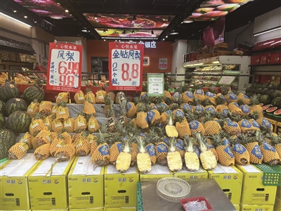 在不少水果店中,凤梨也被摆放在了“C位”。据走访获悉,大多数水果店现在卖得都以金钻凤梨为主,价格也都在8—10元之间。某水果店老板李女士告诉记者,接下来还会有芒果凤梨上市,口味更酸甜浓郁,颜色也更深一些,顾名思义,像芒果一样香甜,但价格会高一些。