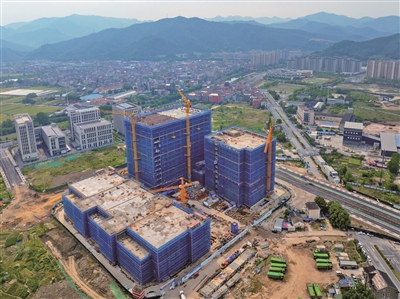 本报讯(记者 方利丹 摄影 朱啸尘 通讯员 王雨沁 徐森鹏)近日,随着最后一块屋面梁板浇筑完成,由产业集团下属富春湾集团建设的浙江光电激光核心材料及设备零部件制造项目(一期)主体结构顺利封顶(右图),比原计划提前1个月。