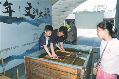 除了元书纸精品展陈,现场还特设非遗竹纸体验区,全方位呈现大源竹纸的文化魅力。现场观众不仅可以近距离观摩竹纸制作技艺国家级非遗传承人庄富泉、浙江省非遗传承人朱中华等一众大师展示“一勺浆、一张纸”的古法抄纸技艺,也可以亲自动手感受竹浆在指尖蜕变为纸的奇妙历程。“从选竹、蒸煮、抄纸到晒纸,每一道工序都离不开非遗匠人的精湛技艺。”带着孩子亲身感受完抄纸这一古老技艺的乐趣后,叶女士表示这让她和孩子更加深入地了解了大源的竹纸文化。“下次我还想带着孩子去大源参加竹纸文化研学活动,沉浸式体验竹纸的制作过程。”