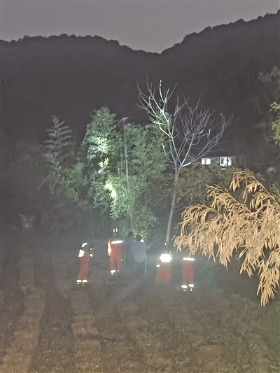 几分钟后,消防部门云梯车抵达现场。消防员架设云梯靠近救援时,孔雀受惊,飞至附近大树顶端。民警与消防员随后用绳子和木棍制作简易救援工具,在齐心配合下,很快套住孔雀腿部,将其缓缓牵拉至地面。