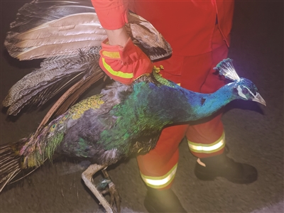 民警检查发现,孔雀体表无外伤,随后驱车将孔雀送至位于银湖街道的涉案野生动物保护管理中心专门收治点。经中心工作人员确认,这是一只亚成体的雄性蓝孔雀,为“三有”保护动物(指国家保护的有重要生态、科学、社会价值的陆生野生动物)。