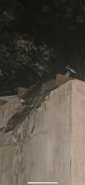 接警后,银湖派出所民辅警赶到现场,发现一只孔雀蜷缩在距地面约4米高的平房屋顶边缘,羽毛凌乱、精神萎靡。因无法判断孔雀是否受伤或存在攻击性,民警疏散围观群众,同步联系消防部门协同救援。