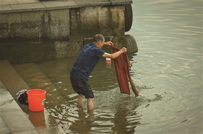 如今,虽然生活条件与过往有天地之别,家中自来水管网、专用洗衣台、洗衣机早已是平常之物,但江边洗衣依然为一些老人所喜爱,成为时常在“母亲河”畔上演的场景。
