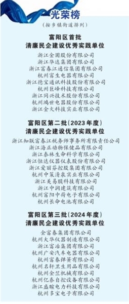 •2022年5月,印发《杭州市富阳区强化民企纪检组织作用助力清廉民企建设实施办法》。