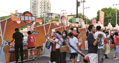 比赛进行的同时,富阳体育中心广场上,“篮潮热市”热闹开集,近50个特色展位串联成一道缤纷的风景线。永康五金生活馆展区以“五金之都”为主题,充分展现其硬核制造实力。钛系列保温杯、精致锡制挂件以及智能小家电等展品,吸引众多富阳市民驻足选购。