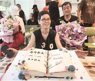 过生日当然要有蛋糕。未能到场的忠实书友特地定制蛋糕,送到活动现场。蛋糕的形状是一本展开的书,嘉宾与书友一同分享这份幸福。1995年至2025年,三十而立的年纪,开开书店的下一个30年,由大家共同守护。