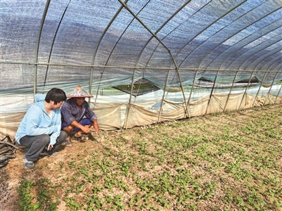 在位于东洲街道的杭州盘古生态农业开发有限公司,区农业技术推广中心的蔬菜专家仔细查看遮阴、灌溉等设施设备和蔬菜的长势,并现场为农户指导如何让叶菜更安全地度过高温天气。