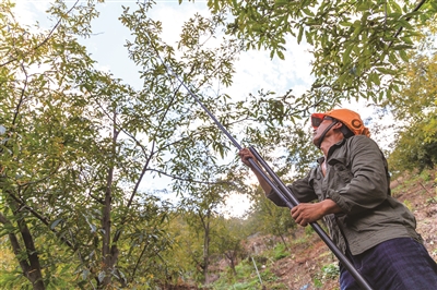 “现在不光是加工用上高科技,我们这些老农民也用上了高科技。你看这个电动打山核桃机器,两千多元一台,充好电可以用一天。只要往树梢上一放、一按开关,山核桃就全部震下来了。人不费劲,树不伤枝,也不会有果子留在树上,还特别快。”何奉奇说,现在方里村有不少农户都购置了电动打山核桃机,还有一些农户购置了采收网,更加省时省力。
