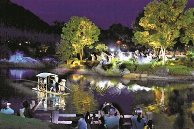 黄公望隐居地的暮色中,秀湖水雾氤氲,竹筏载着越剧演员缓缓穿行,婉转唱腔混着潺潺水声漫向夜空。岸边,白发老戏迷跟着节奏轻拍手掌,孩童踮脚指着“从画里走出”的演员欢呼,年轻观众举着手机记录下这“人在景中、景随人动”的瞬间——这是上个月富阳越剧艺术传习院实景演艺《富春长歌》的演出现场。
