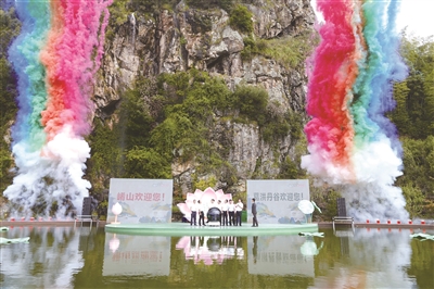 仪式高潮处,葛洪丹谷文旅图正式发布,“三山三水一客厅”联动推介方案同步揭晓,现场掌声不断。在尚香合唱团《富春》的歌声中,区领导与嘉宾共同按下开园启动键,五彩云烟伴着欢呼声在山谷间散开——崤山小叠空正式开门迎客,胥口镇金秋文旅嘉年华也由此进入“狂欢时间”。