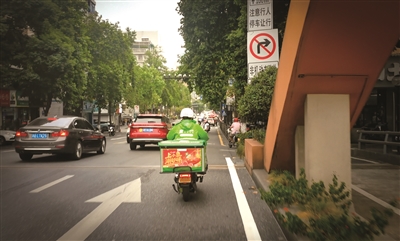 早晨7点半,一名外卖员骑着电动自行车,正急着为顾客配送生鲜。