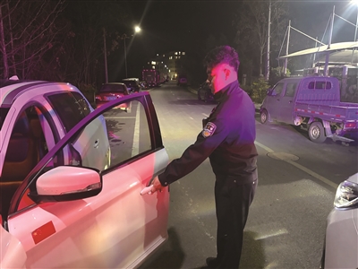 当天,万市派出所组织警力,加大夜间及重点时段对居民小区周边、背街小巷、公共停车场等车辆停放集中区域的巡逻盘查力度。民警采取“徒步巡查+随机抽查”的方式,对停在路边的车辆逐一检查车门、车窗是否关锁完好。行动中,民警总计拉了20辆车门,其中有4辆车未落锁,有些车辆内还存放有贵重物品。