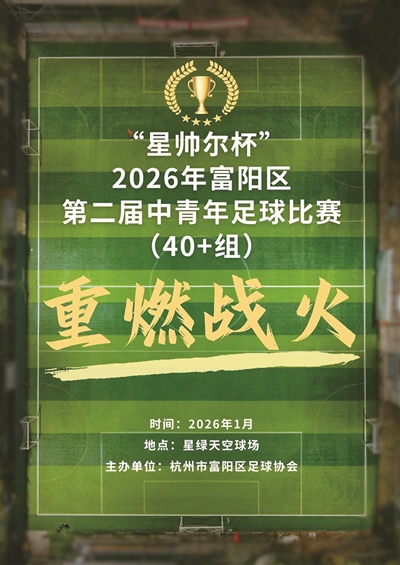 “星帅尔杯”2026年富阳区第二届中青年足球比赛(40+组)将于1月10日上午9:30在富阳二中天空足球场火热开赛。共有来自富阳本土的星帅尔、0571、古德曼、富春东吴、富阳电力、万能、富阳70、富春苍狼、安耐特、新城FC、81兄弟连、永纳联队等12支足球队参与这项赛事。